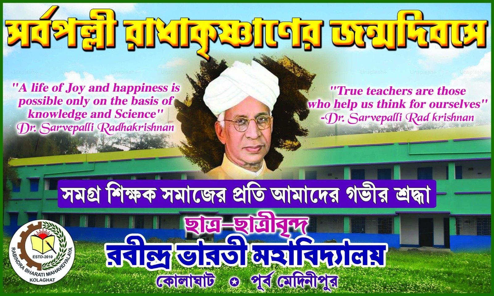 To fulfil the aspirations of the local people Rabindra Bharati Mahavidyalaya was established in 2010 as a general degree college. The college is affiliated to Vidyasagar University and is aided by Govt. of West Bengal. It is situated at the entrance of the district Purba Medinipur by the side of the Rupnarayan River. At present the college shares the premises of Kola Union High School in the morning shift and the college authority is trying their best for the construction of its own college building at Kolaghat town...